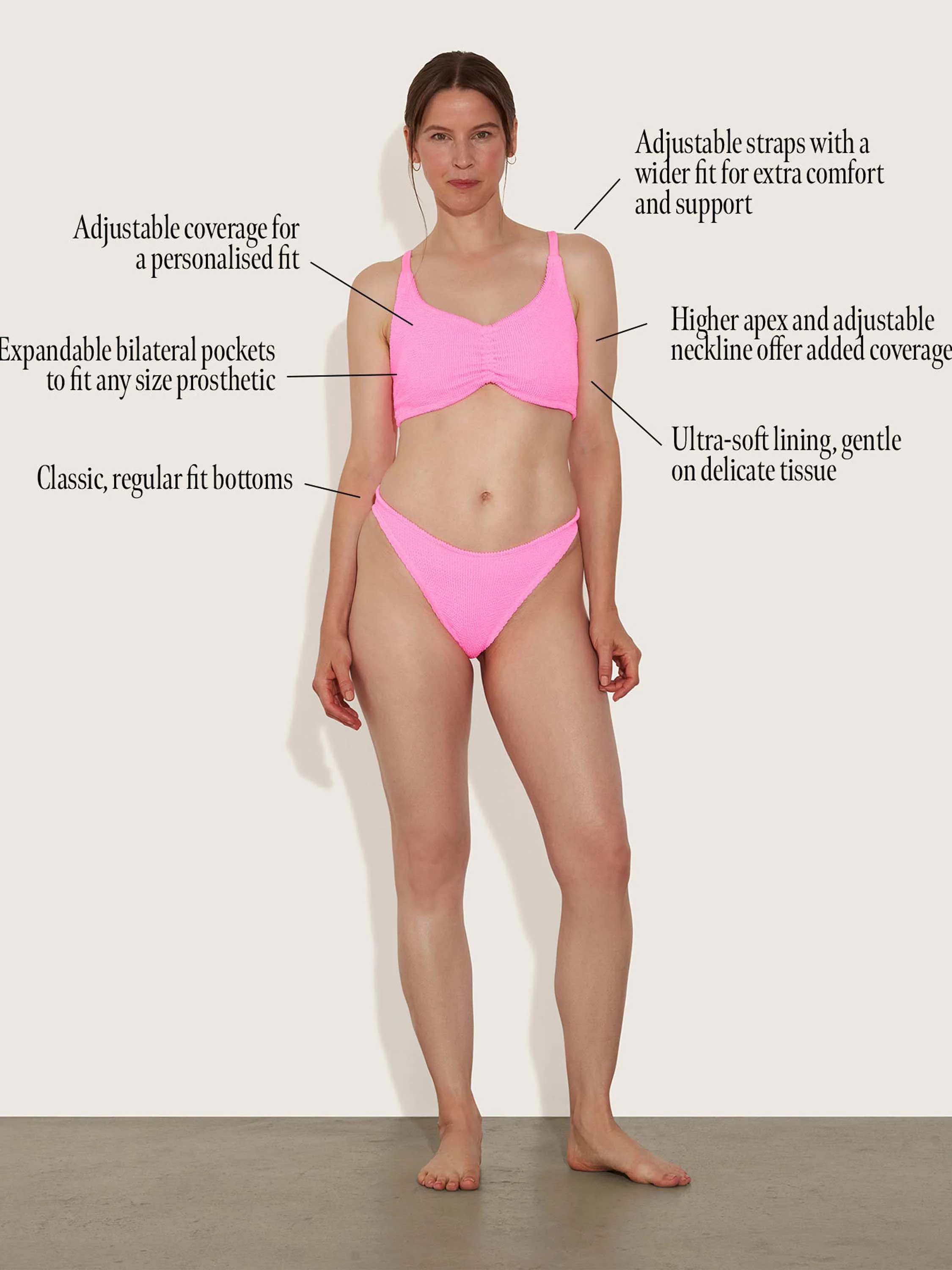 The post-mastectomy bikini features a higher apex on the top and an adjustable centre front for added coverage where desired. Concealed expandable bilateral pockets fit prosthetics of all sizes, while the ultra-soft lining is designed to be gentle against delicate tissue. Wide adjustable straps offer comfort and support. Our signature Original Crinkle™ fabrication and styling, made for every body.